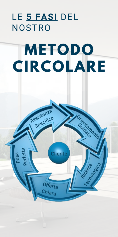 L’appellativo “circolare” che abbiamo scelto per definire il nostro metodo di lavoro si riferisce al fatto che, per qualsiasi nuova esigenza che il cliente dovesse avere anche dopo la posa, il processo si ripete dall’inizio fino alla completa soddisfazione del cliente e delle sue esigenze.